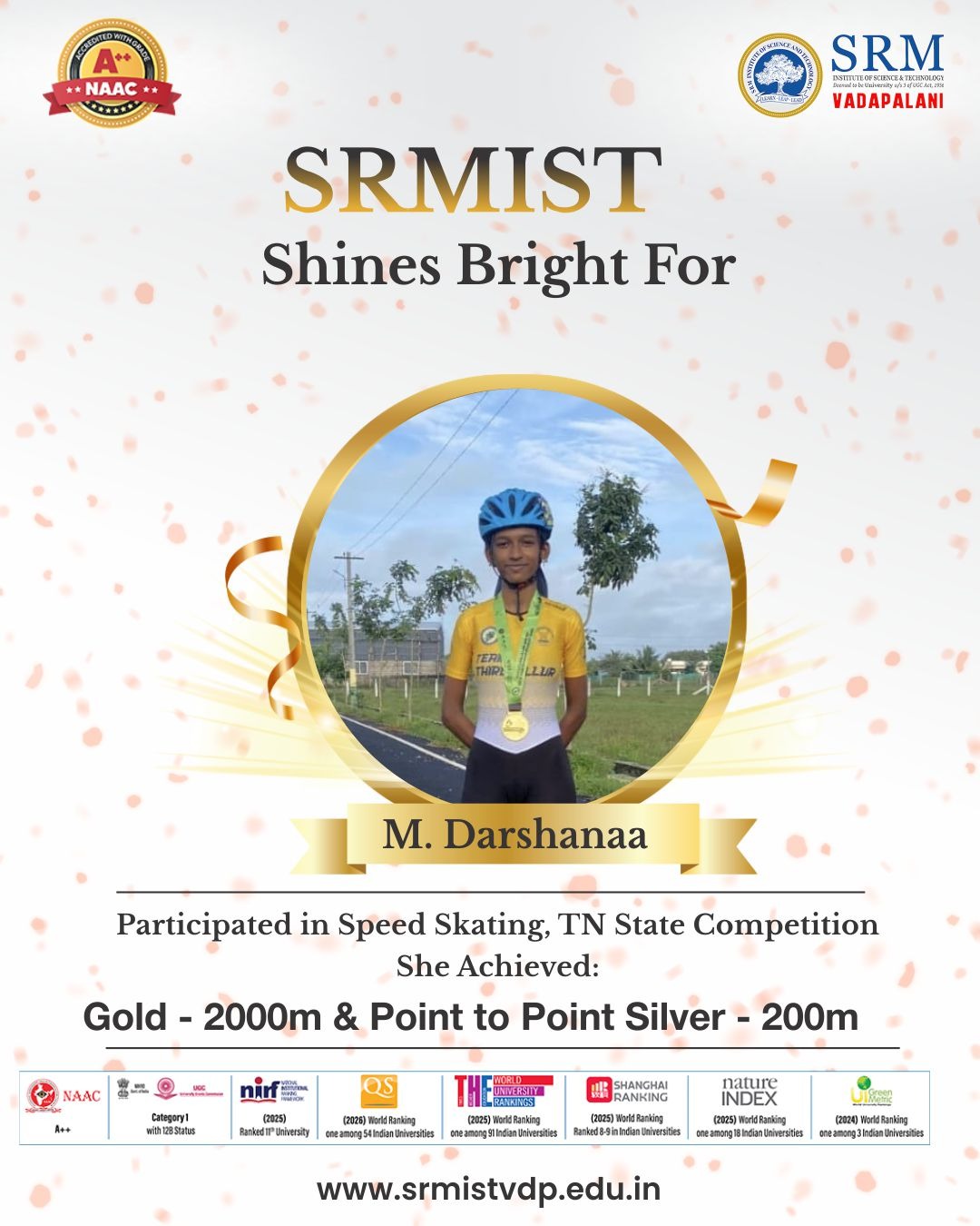 We’re proud to celebrate M. Darshanaa, a First-Year student of ECEDS, SRMIST Vadapalani, for her stellar performance at the Tamil Nadu State Speed Skating Competition held from 23rd–26th October.